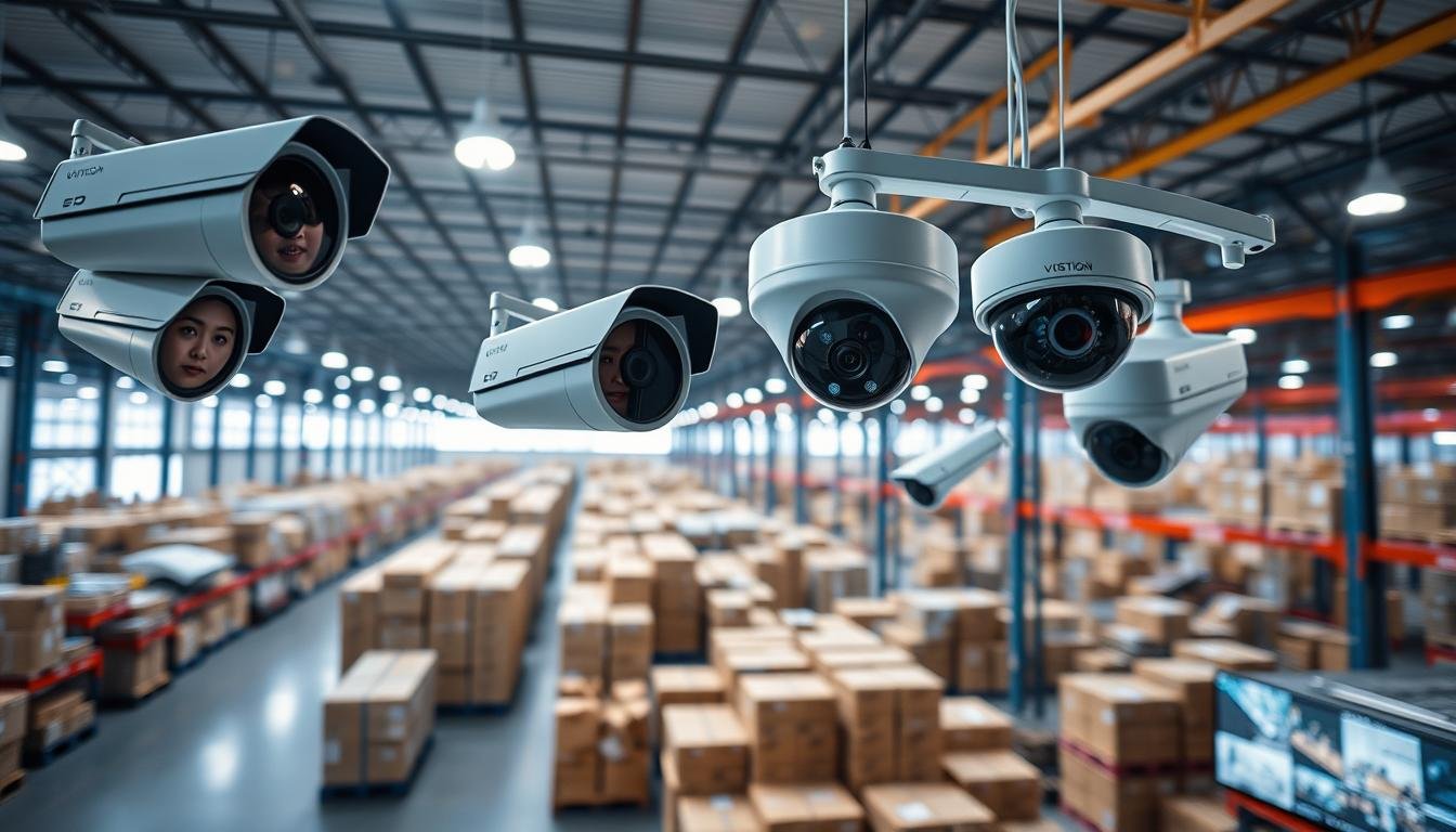 Warehouse interior with high-mounted bullet and dome cameras: