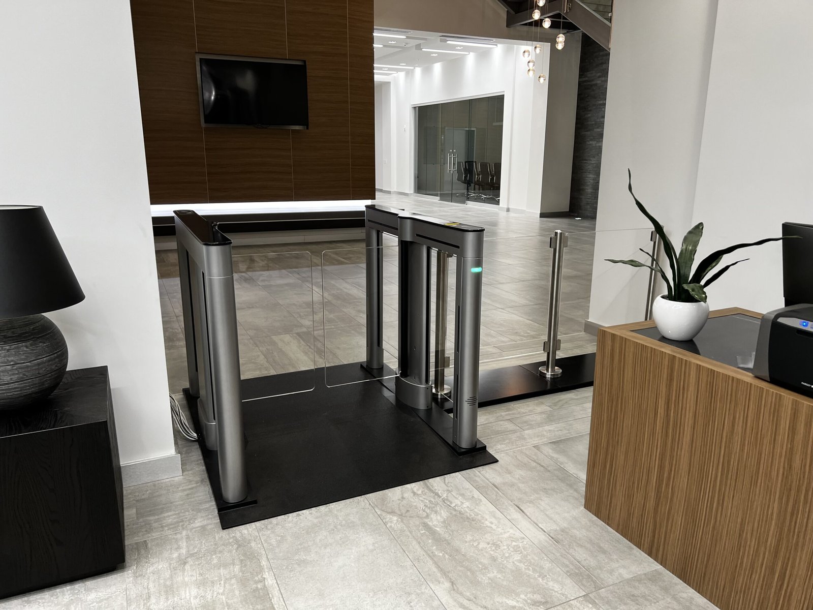 Flap barriers or swing gates are ideal for their speed, aesthetics, and biometric integration.